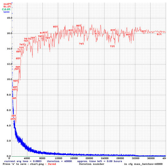 To test whether the proposed method and parameters are limited by the number of training sessions, the same dataset, same server, and the same parameters and settings were used and the number of epochs was increased to 40,000. Figure 11 shows the mAP curve and the mean loss curve with epochs set to 40,000 times. As can be seen from Figure 11, the mAP value of the experimental results is 81.2%, and the average loss rate is 0.0803. Furthermore, the mAP value stabilizes when the epochs are at 20,000 times. Therefore, when the epochs increased to 40,000 times, the accuracy did not improve and the average loss rate was close to zero. This result shows that the results of the proposed method have reached the best value. Table 5 shows the individual mAP values for 10 experiments. The results of these 10 experiments yielded an average mAP value of 91.49%.