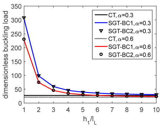 Variations of dimensionless buckling loads for cantilever and propped cantilever AFG-tapered microbeams with respect to h1/l for different taper ratios are illustrated in Figure 2 and Figure 3, respectively. It can be seen from these figures that size-dependent buckling loads decrease by increasing h1/lL, approaching classical results. Moreover, it is observed that the critical buckling loads for are greater than those for .