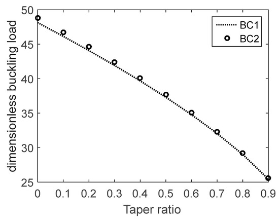 Influences of nonclassical boundary conditions on the size-dependent dimensionless buckling loads with respect to various taper ratios for cantilever and propped cantilever microbeams are depicted in Figure 4 and Figure 5, respectively. It can be found from the figures that a decrement occurs in the buckling loads when increasing the taper ratio. Furthermore, the difference between the critical buckling loads evaluated for BC1 and BC2 is more evident for smaller taper ratios, especially for a uniform cross-section when . This difference diminishes by increasing the taper ratio.