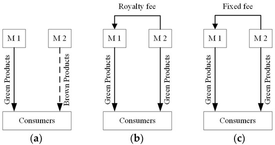 In addition, some scholars have studied other aspects of market competition of green products. Zhang et al., analyzed the coordinated pricing strategy of green and brown manufacturers in two production modes: cooperative games and non-cooperative games. The results show that the system performance of a cooperative game is obviously better than that of a non-cooperative game [32]. Zhu and He analyze the impacts of important factors, including green product type, supply chain structure and competition type, on product greenness design [33]. From the above literature, it is found that at present, the literature on market competition of green products mainly focuses on the problems of pricing and quantity decisions, while how green technology licensing affect the competition and cooperation relationship among competing firms and the corresponding decisions has not been studied, which is the focus of this research.