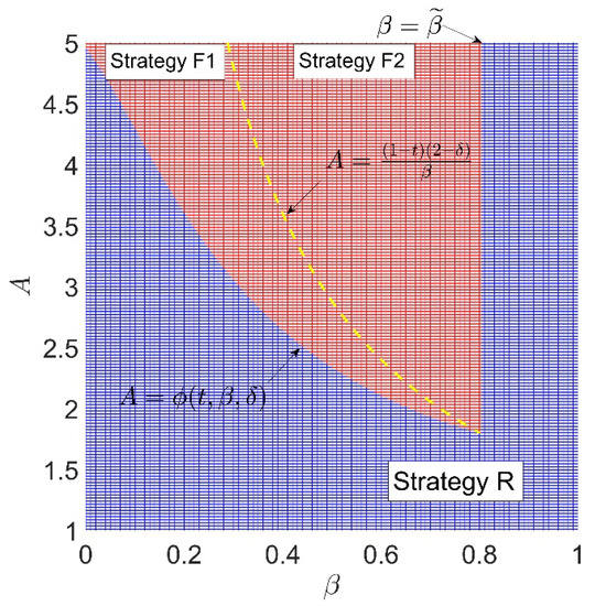 Secondly, when the substitutability of products is not high (), the decision region of optimal licensing strategy will be divided into three parts based on different values of potential market share A. When the potential market size of green products is very small, the optimal strategy is royalty licensing. On one hand, when A is small, Manufacturer 1’s profit increase under strategy F is not high, while royalty licensing can effectively defend the market share cannibalization from Manufacturer 2. Therefore, when A is relatively small, royalty licensing is preferred by Manufacturer 1. When the market size is large, enterprises will choose the fixed-fee licensing strategy. In this region, the market size expansion effect is strong while the competition effect is weak. The demand erosion effect of Manufacturer 2 to Manufacturer 1 is not strong. In this region, when fixed-fee licensing is adopted, the total supply chain efficiency will increase in comparison to royalty licensing (which generate double marginalization effect). Therefore, choosing the fixed-fee licensing strategy is more beneficial for manufacturer 1. At the same time, under this strategy, the output of both enterprises will be increased, which will also have a positive effect on environmental benefits and overall social welfare. Interestingly, combining (1) and (2), it is found that the impacts of substitution level on strategy choice is non-monotonic. When fixing the market size increment level , the strategy switches from R to F, then back to R.