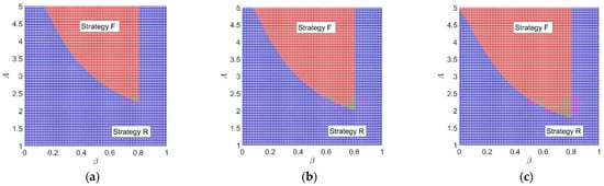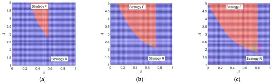Lastly, it can be seen from Figure 3 and Figure 4 about the impacts of and on the decision regions. It is found that the shape of the decision region will not be affected by the level of and the production cost reduction , but the size of the regions will change with the two parameters. A higher level of social responsibility weakens manufacturer 1’s incentive to choose royalty licensing, while strengthen the incentive to choose fixed-fee licensing. This corresponds to the above analysis that fixed-fee licensing helps to achieve higher sales quantities of green products and achieve higher environmental payoffs for Manufacturer 1. Therefore, when Manufacturer 1 is more concerned about the environmental payoffs, fixed-fee licensing becomes more attractive. Moreover, when the cost saving effect is relatively strong, Manufacturer 1 becomes more willing to implement strategy F. From the results in Proposition 3, it can be observed that both parties’ payoffs rise in . Therefore, when becomes higher, both manufacturers can benefit more from technology licensing, which makes strategy F more attractive for manufacturer 1.