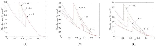 From Proposition 1, it shows that, in the scenario of technological monopoly, the payoffs of the manufacturers will be jointly influenced by the market size of green products, the substitutability degree of products, the environmental benefit indicator and the production cost . Firstly, it shows the impacts of market size on the equilibrium results. When is relatively small, Manufacturer 2 can enter the market and earn positive profit. However, when is relatively higher, Manufacturer 1 will set a higher sales quantity such that manufacturer 2 cannot enter the market due to its disadvantage of market size. Secondly, it shows that when the competition intensity is relatively small, Manufacturer 2 can enter the market successfully. However, when the competition intensity becomes relatively high, Manufacturer 1 will set a higher sales quantity to drive Manufacturer 2 out of the market. Thirdly, without technology licensing, if Manufacturer 1 is more careful about the environmental payoff, it will set a higher sales quantity to drive Manufacturer 2 out of the market. The reason is that, to maintain a higher level of environmental payoff, Manufacturer 2’s goal is to increase the total sales quantity of green products, while to decrease the quantity of brown products in the market. Therefore, when the parameter of is higher, it will be more aggressive to drive Manufacturer 2 out of the market and achieve higher environmental payoffs. Conversely, when is lower, Manufacturer 1 cares less about the environmental payoffs. Therefore, it gives Manufacturer 2 a chance to enter the market. Lastly, when the brown manufacturer’s production disadvantage is higher, it will be more likely to be driven out of the market when the green manufacturer releases more products to the market, which conforms to intuition.