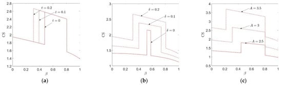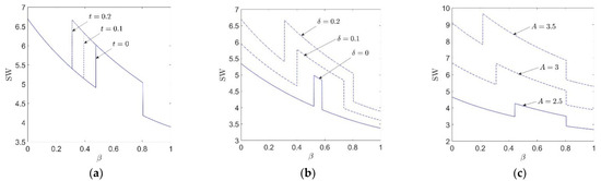 Then, it shows the impacts of product substitution level on CS and SW. Interestingly, it is found that both CS and SW are nonmonotonic in . CS or SW experiences a sudden jump when the equilibrium strategy switches from R to F; then experiences a sudden drop when the equilibrium strategy switches from F to R. This provides a counterintuitive result that intense competition does not always benefit consumers and the society in a coopetition environment.