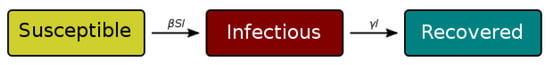 These equations describe the difference in the number of susceptible persons at time t. According to [7], assuming that the total population is n, then the probability of a randomly chosen person being in the susceptible state is . Hence, an individual in the infected state will contact (on average) people in the susceptible state per unit of time, which implies that the number of newly infected persons is (as there are people in the infected state at time t). On the contrary, the number of people in the susceptible state will decrease by . Additionally, as every individual in the infected state will recover with rate , there are (on average) people recovered at time t. This explains the difference of at time t. The variables , and still satisfy Equations (11)–(13), and thus we have: