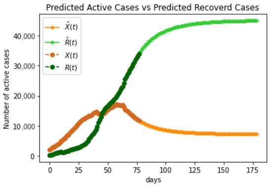 Predicted active cases vs. predicted recovered cases based on the time-dependent SIR model. is the actual number of infected (active) cases; is the predicted number of infected cases; is the real number of recovered cases; and is the predicted number of recovered cases.