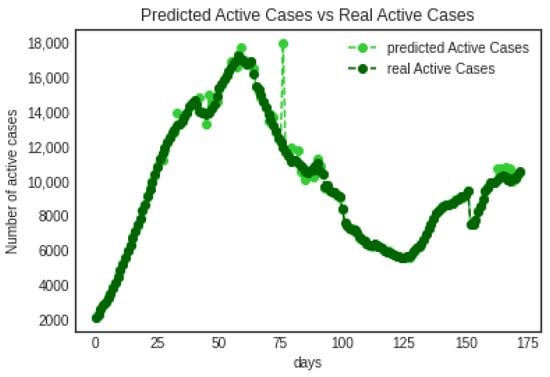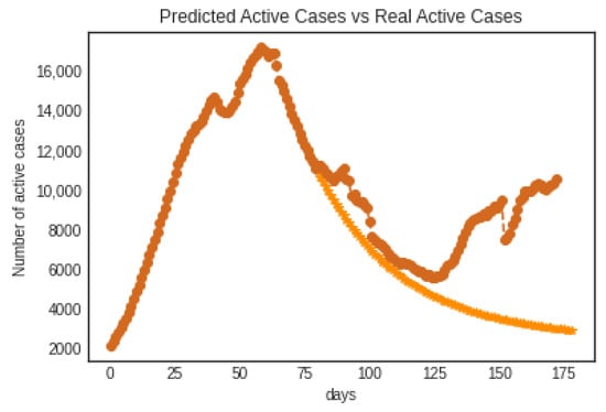 Figure 5 shows the evaluation of the time-dependent SIR model of COVID-19 in the United Arab Emirates from 7 April 2020 to 20 August 2020. The model catches the same peak time with a very accurate value during the training period. However, Figure 6 shows an accurate comparison between the predicted and actual active cases. The model was not able to predict the next peak after finishing the simulation period (after 125 days). The regression model learns from a specific dataset, and these data contain one peak only.