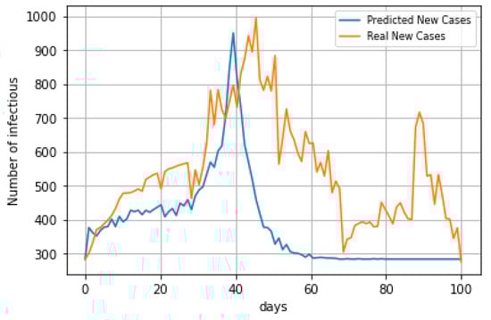 We can see that, within our observation period, the model was able to predict the peak time and the peak values. The model was able to detect the effects of government interventions and social distancing. Regarding the number of active and daily new cases, our model showed adequate results compared to the real values, which are represented in Figure 7 and Figure 8.