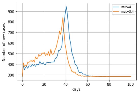 - Decreasing the expected number of days for an existing infectious person to infect others (3.4 versus 4 days) would considerably decrease the peak level.