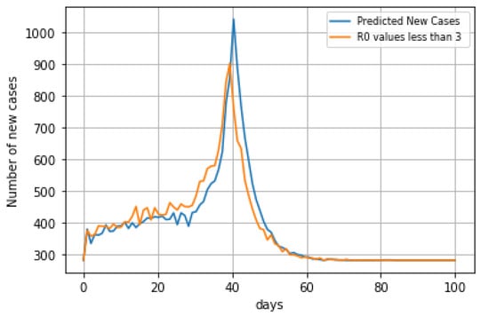 - By reducing R0 to less than 3 for the first five days, the number of new cases would peak on the same day, however, with much lower peak values.