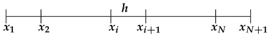 Consider solving an ordinary differential equations in one spatial variable, x, and on the domain . Firstly the domain is divided into N sub-intervals or elements of spacing , by placing the dividing points or nodes, , as illustrated in Figure 2. We shall refer to this discretization as the mesh
