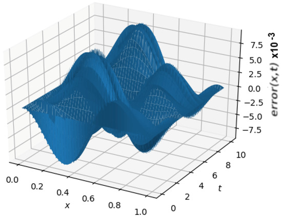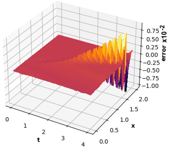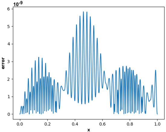 After solving (51), the solution is constructed on each sub-interval using the appropriate coefficients and can then be plotted. Since there is very good agreement between the approximate solution and the exact solution, we choose to show the error plot () in Figure 4 for .