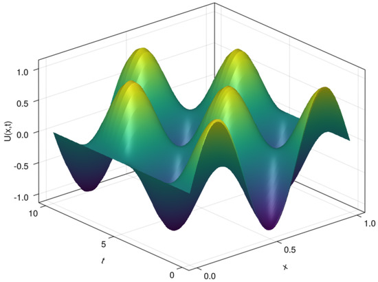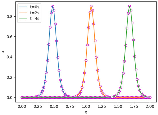 We substitute the collocation points into (61) to obtain a matrix vector system whose solution yields the value of the coefficients at . Equations (60) and (61) is easily converted to a system of of IVPs which can be efficiently solved using the Julia QNDF solver (which is equivalent to the ODE15s in Matlab). Thereafter the PDE solution over the domain is obtained from Equation (56). Figure 7 depicts the solution profiles for various t values. This example describes a wave propagating in the positive × direction. In this figure the solid line represents the exact solution and the circles the approximate solution. It is clear the approximate solution closely matches the exact solution. The 3D solution and error are shown in Figure 8 and Figure 9, respectively. We see that applying the quintic OCFE method in space combined with a powerful stiff ODE solver in time is capable of producing a very smooth and accurate solution.