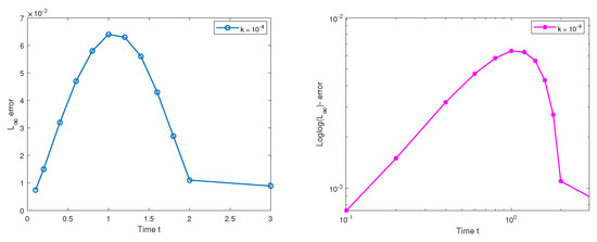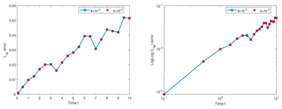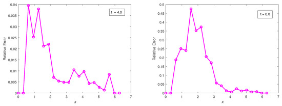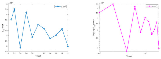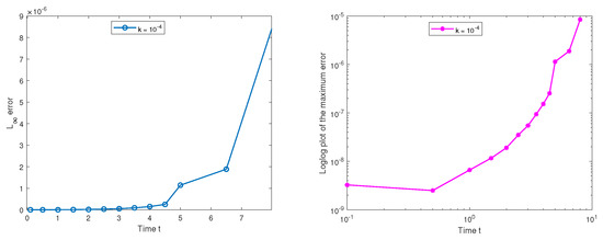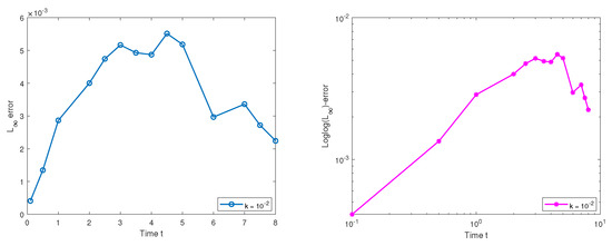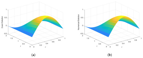 - We solve the 2D homogeneous equation [44]with subject to the initial conditionand the boundary conditions are given byThe exact solution is . We used for this experiment.