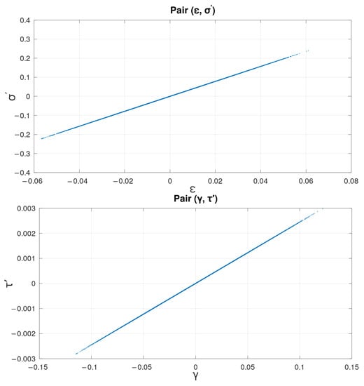 We note that in case of potential (26), the analytical expressions for the dilation response (32), the squeeze response (33), and the shear response (34) help to propose independent pairs. Modifications and result in independent responses that are confirmed by the virtual experiment, see Figure 2. Such a fortunate solution is possible due to specific forms of the analytical expressions (32)–(34). The other potentials do not grant such modifications since their response functions are essentially nonlinear functions.