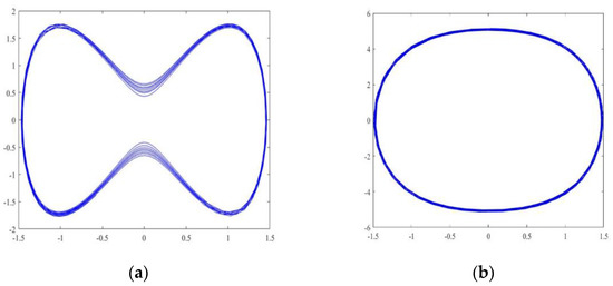 The nonlinear dynamical characteristics of the unperturbed and perturbed system of Equation (13) are given, respectively. Based on the eigenvalues calculated in Equation (5), the homoclinic bifurcation exists in the system (16) when . Let and , the equilibrium point is obtained; discuss the parameter settings as follows: