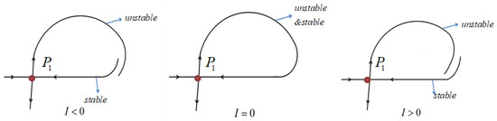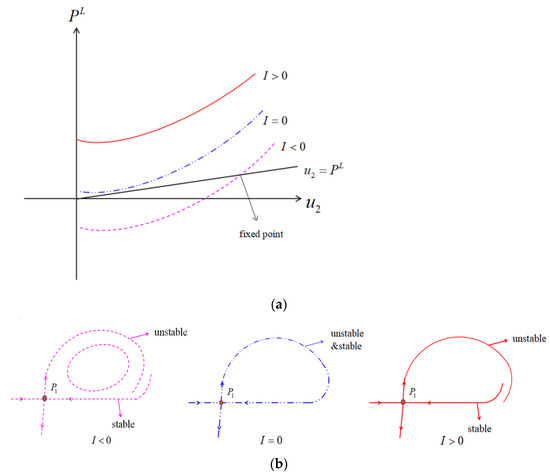 In Figure 5a, when the equation is satisfied, the graph has an intersection point for , it is the fixed point in case 1. The fixed point is stable and hyperbolic, since for sufficiently small. From the topological structure in Figure 5b, it is concluded that the fixed point corresponds to an attracting periodic orbit of Equation (18). The fixed point would occur for , while the homoclinic orbit breaks.