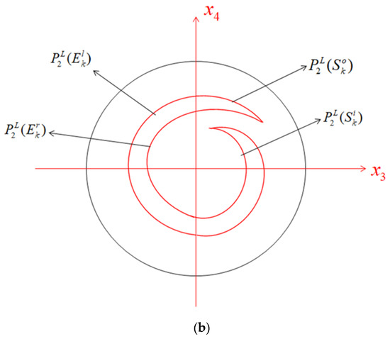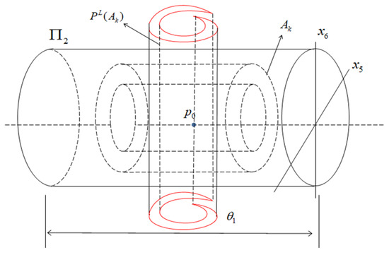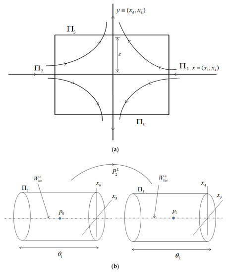 The geometric structure of and under the situation is given in Figure 4. From Figure 4, the map is mapped from to . The flow is defined by the linearization of the system about the origin point, which is expressed as , . There is a point to reach under the action of Equation (18) given by solving . Both and are the initial values. The map is denoted by: