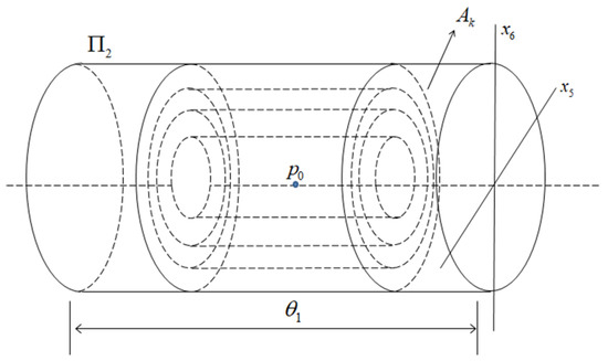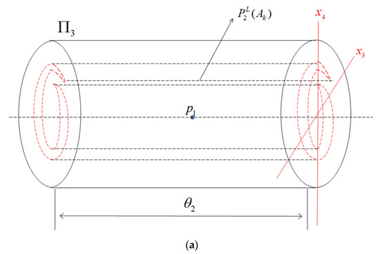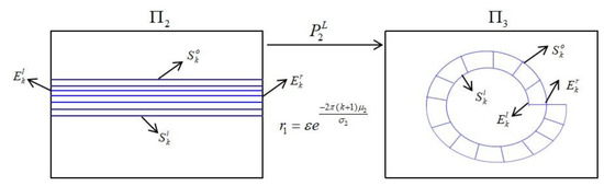 Figure 7a represents a cross-section diagram taken from two three-dimensional solid torus structure diagrams. Figure 7b describes the process of the map in the three-dimensional solid torus structures and , respectively. Let , the time mapped is obtained from to . The map is denoted as