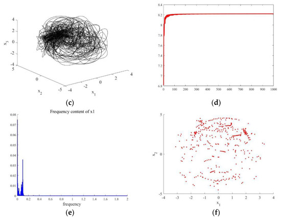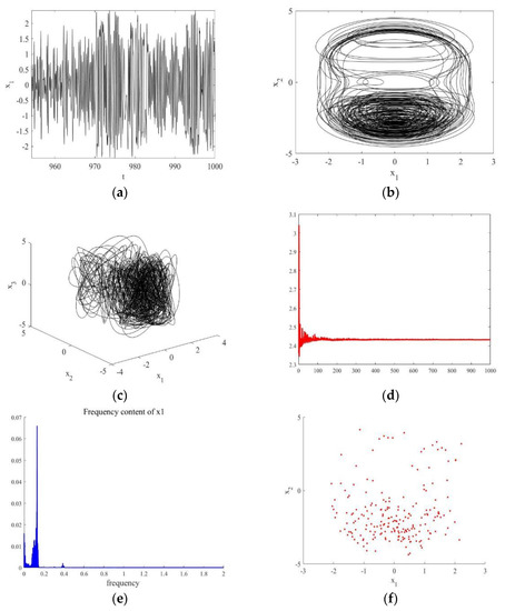 The trajectory under the condition . (a) The waveform on the plane (,); (b) The phase portrait on the plane (,). (c) The phase portrait in the three-dimensional space (,,). (d) The Maximum Lyapunov exponent plot of . (e) The power spectrum of . (f) The Poincare map on the plane (,).