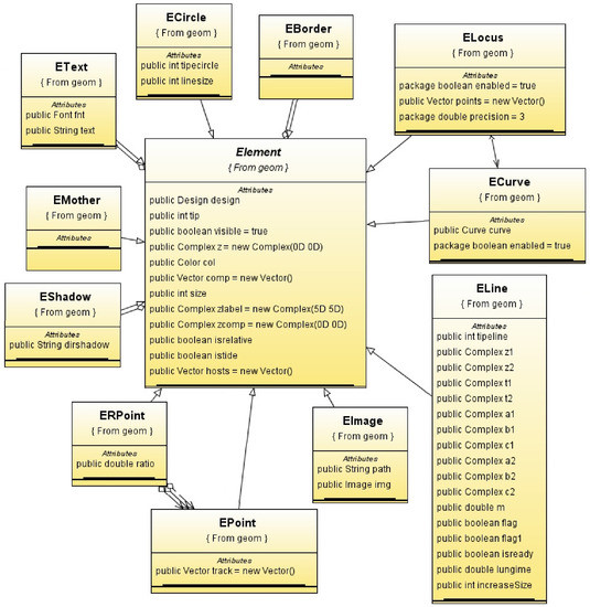 We can remark that the classes’ modelling geometric entities are built starting from the central class ‘Element’. This approach emphasizes a suitable design, both from a conceptual viewpoint and an implementation viewpoint. Conceptually, each entity has the same abstract model that can derive particular models with specific properties and behaviour. This is visible by the fact that objects as ‘ECircle’, ‘ECurve’ and ‘ELine’ inherit the central entity ‘Element’.