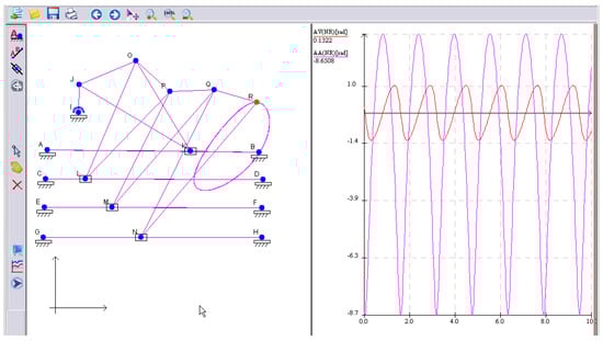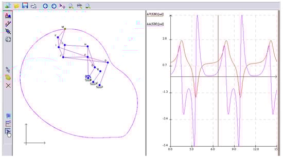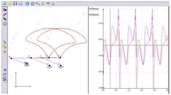 Let us assume a jointed quadrilateral (a 4-sided polygon) of a crank mechanism working with a combustion engine having a connecting rod. In Figure 8, the trajectory of a point linked to the connecting rod is presented on the left-hand side of the window, where we can observe the mechanism. On the right-hand side, the diagram for the kinematic analysis of the mechanism is presented; the dynamic evolution can help a system designer or system analyst to work properly with this software.