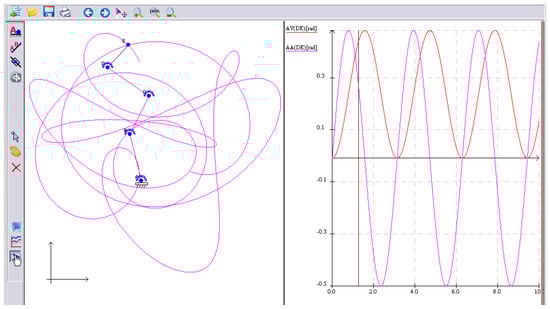 Regarding the kinematics of mechanical systems, we mention the following software tools. SolidWorks (www.solidworks.com (accessed on 15 November 2022)) is a commercial computer-aided engineering application. The disadvantages of SolidWorks are given by the high cost and the fact that it requires a powerful Windows computer (being limited only to a Windows operating system). Even regarding its 2D functionality, our approach could be a better option. MechAnalyzer (www.roboanalyzer.com/mechanalyzer.html (accessed on 15 November 2022)) is a free software mainly used for teaching 3D mechanisms; it is related to a software used to teach and learn robotics [11]. It can perform a synthesis of four-bar mechanisms. Its dynamic geometry module is less developed. Moreover, it does not present kinematic diagrams, and so the kinematic analysis of linkages and other related issues are not explicitly treated. GIM (www.ehu.eus/compmech/software (accessed on 15 November 2022)) is devoted to the kinematics and dynamics analysis of planar and spatial mechanisms [12]. It is limited by the use of the Windows operating system. Sometimes, its interface is not so intuitive. Comparing with our approach, it also has some dynamic geometry limitations. The kinematics software ASOM (visit asom.eu/en/ (accessed on 15 November 2022) for details) is a licensed software for linkage design and for the simulation of multi-bar mechanisms. It offers an intuitive handling, and several advanced features for synthesis, analysis and optimization of the multi-bar systems. The licensing costs and requirements reduce its benefits.