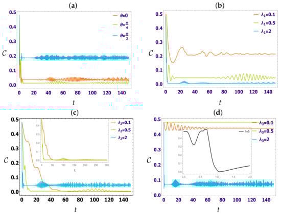 The non-classical behaviour of the qubit subsystem is illustrated in Figure 4 with different values of coupling strengths, and mixture angels are taken into account. From Figure 4a, the behaviour of non-classicality at is effectively that formed at and . The super-mixed angle reduces the non-classicality of the qubit system. Further, Figure 4b exhibits the effect of different strengths of magnon–resonator couplings at a super-mixed angle. Clearly, as the strength of the magnon–resonator coupling increases, the qubit non-classicality vanishes. In Figure 4c, we show the influence of the qubit–resonator coupling on the function , where . Obviously, the interior Figure 4c shows that, as time increases, the coupling does not recreate the quantumness of the qubit system. Moreover, the effects of different values of classical field coupling are shown in Figure 4d at a super-mixed angle. The non-classicality is stable at the maximum value with , while it decreases at other values. Thus, it is better to know the influence of the classical field at a fixed time (). The black curve shows the non-classicality is maximum at . Then, it decays as the coupling of the classical field increases.