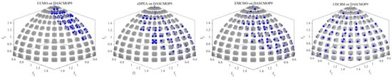In addition, two widely used performance metrics were employed: Inverted Intergenerational Distance (IGD) [27] and High Volume (HV) [28]. The smaller the required IGD value, the larger the HV value. The non-parametric Wilcoxon’s rank-sum test [16] was performed on the IGD and HV results at the 95% confidence level [29]. The symbols “+”, “−”, and “=“ indicate that the comparison algorithm is significantly better, worse than, or comparable to CDCBM, respectively. The best measure for each question is highlighted in grey in each table.