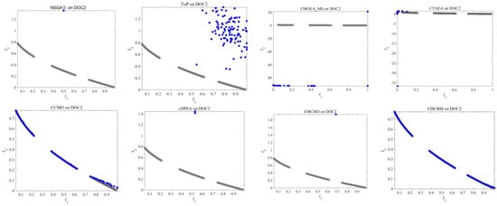 Solutions with median IGD value among 30 runs obtained by NSGA-II, ToP, CMOEA_MS, CTAEA, CCMO, cDPEA, EMCMO, and CDCBM on DOC2.
