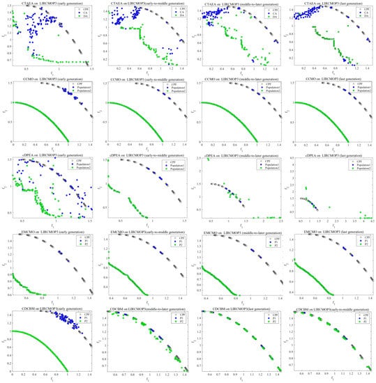 CDCBM: In the early stage, P2 converges to the UPF regardless of constraints, and the generated descendants help P1 converge to the feasible region. In the early-to-middle generation, as the gradually decreases, P2 gradually comes to the boundary of the feasible region. In the process of searching from UPF to CPF, P2 retains many potential infeasible solutions. These solutions help P1 find most of the CPFs, but some CPFs are still ignored during evolution. Therefore, in the middle-to-later generation, increases to a (a constraint tolerance value that gradually decreases with the evolutionary algebra), and P2 returns to the feasible region boundary to repeat the search. In this process, we will also judge the success rate of the parent and the offspring to more effectively provide a complementary evolutionary direction for P1. In the final generation, P1 finds all feasible regions and has a relatively good distribution.