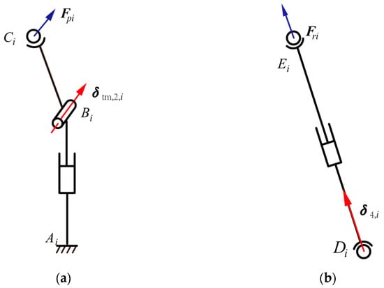 Let be the limb deformations along the forces ; be the limbs ’s deformations along the forces , and be the deformations of the moving platform m. According to the principle of virtual work, the equation is obtained as follows: