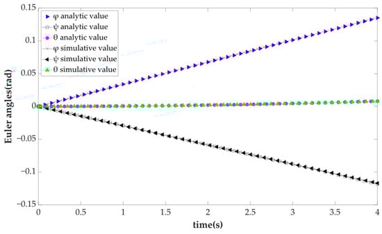 In the simulation, each actuator is given a constant velocity and then the simulative results of the positional postures are obtained. Meanwhile, in the numerical calculation of (15), let the be the linear function of time t, for which the coefficient is . Then, we obtained the analytic results and compared them with the simulative results to verify the positional posture model. The curves of the posture parameters from the analysis and simulation are shown in Figure 8.