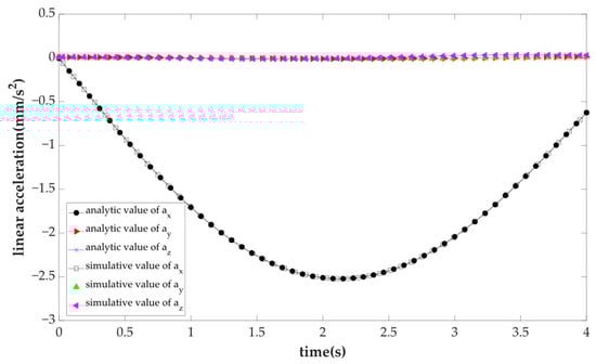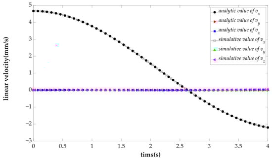 For this exemplar PM, let the actuator move according to the items shown in Table 3. In the analytic process, when the initial lengths of three SPS limbs and the velocities of the actuators are provided, the velocity v and ω of m can be calculated based on (30) and (32). Given the initial lengths of three SPS limbs, the velocities and the accelerations of the actuators, the acceleration a and ε of m can be calculated based on (40). In simulations, in the simulative PM, three simulation-driven modules are set for (i = 1, 2, 3), a velocity/acceleration sensor is set for m, and sensor values can be displayed by scope. Appling identical , calculated above the corresponding simulation-driven module, the comparison between analytic results and simulative results of linear velocity, angular velocity, linear acceleration and angular acceleration are respectively shown in Figure 10, Figure 11, Figure 12 and Figure 13.