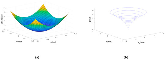 The 3SPS + 3PRS PM has the approximate centering function, which can constrain the center of the moving platform in a certain space encircling the axis. Figure 15a shows that the offset value between and the axis through is less than 5 mm if angle rad or rad. Figure 15b shows that the change value of displacement of in the or direction is less than 3 mm if angle degree.
