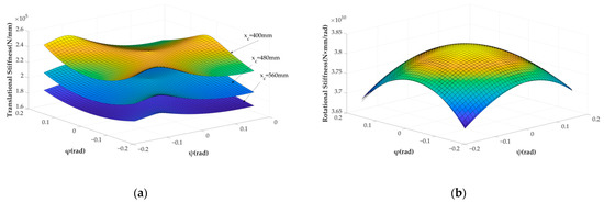 According to Figure 16a, it can be seen that the translational stiffness value increases as decreases, and the maximum translation stiffness values are at points 1, 2 and 3. If the moving platform only rotates around the medians of the triangle , the translational stiffness is better than other positions. Figure 16b shows that the rotational stiffness mainly affected by the Euler angles , and the effect of the on rotational stiffness performance, is minimal.