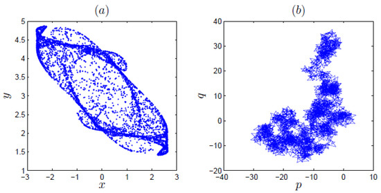 where are the fractional orders and are constant parameters. For , , , , and , the fractional map generates strange attractors, as shown in Figure 1a. Figure 1b shows the translation components using the 0–1 test [25], in which a Brownian-like (unbounded) trajectory is found, indicating the occurrence of a hidden chaotic attractor. Correspondingly, the maximum Lyapunov exponents are calculated as , which confirm the results.