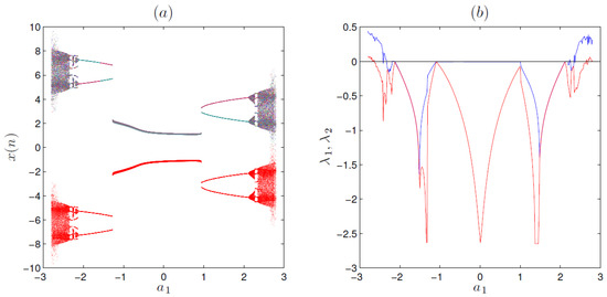 Firstly, we set as the bifurcation parameter and the system parameters are chosen as , , with fractional order . The bifurcation diagram and Lyapunov exponents are derived and shown in Figure 2a,b, respectively. Note that the blue diagram is obtained for the initial condition (IC) , while the red diagram is obtained for . It can be seen that the fractional map shows the phenomena of coexistence hidden attractors in the chaotic and periodic interval. Moreover, the fractional memristor map (12) produces complex dynamical behavior under different bifurcation parameter values, where tangent bifurcation, chaos crisis, period-doubling bifurcation, and reverse-period-doubling bifurcation are included. When the bifurcation parameter is increased in , it can be seen from the bifurcation diagram in Figure 2a that the states of the system start from chaos and go into periodic windows via the tangent bifurcation route. When is further increased, the fractional memrtistor map (12) evolves from a periodic to a chaotic state via the period-doubling route.