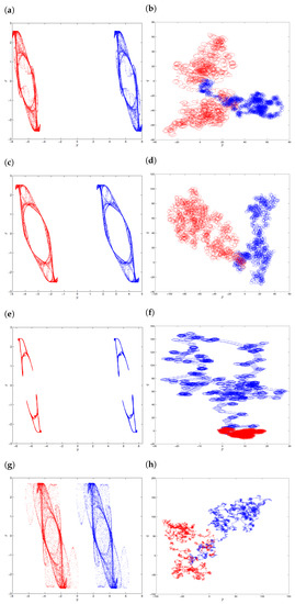 Without a loss of generality, the hidden attractors at several fractional orders corresponding to Figure 2 are shown in Figure 3a,c,e,g. Figure 3b,d,f,h, gives the chaotic dynamics in which the Brownian-like dynamics are a significant occurrence of the chaotic behaviors. The red and blue trajectories stand for the ICs and , respectively.