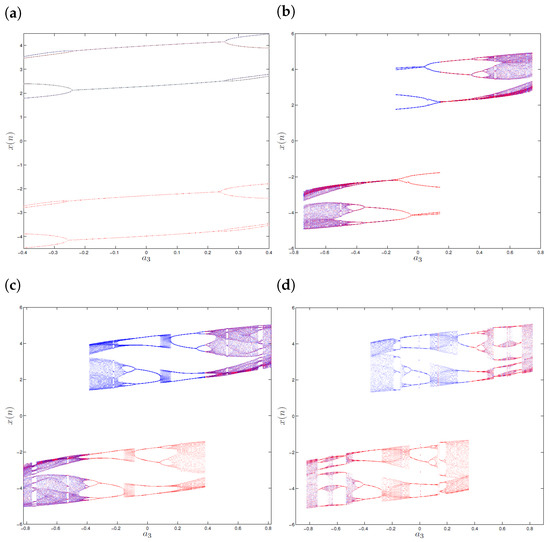 Considering that the system parameter and the initial condition of the 2D fractional memristor map are taken as and IC (blue diagram), IC (red diagram), the coexistence of the bifurcation diagrams versus of the system for fractional-order values are plotted in Figure 4a–c, and Figure 4d, respectively. Different dynamical behaviors, including the chaos, period, and period-doubling routes, and multiple coexisting attractors, can be detected. For , it can be seen from Figure 4a that the fractional memristor map presents periodic behavior around . When , the fractional map is in a chaotic state and eventually goes into a periodic state via reverse period-doubling bifurcation. In the interval , a four-period attractor is observed. As is further increased, the motion trajectories starting from both initial conditions evolve from periodic to chaos via period-doubling bifurcation. The bifurcation diagram corresponding to the fractional order is shown in in Figure 4c. Basically, when the states of the fractional map goes from chaos to periodic attractors via reverse period-doubling bifurcation. However, when the attraction domain of the two attractors are significantly different, where two different types of coexisting attractors are obtained. For example, the state starting from IC (red diagram) shows the period-doubling route to chaos, and then at it jumps into the periodic state. However, the motion trajectories of the IC jump into the chaotic state at and eventually return to the periodic state via inverse period bifurcation. For , a period-doubling route to chaos is observed for both initial conditions. On decreasing the fractional order to , the bifurcation diagram is provided in Figure 4d. The bifurcation diagram in this case is similar to the one in Figure 4c, where more periodic behavior is observed.