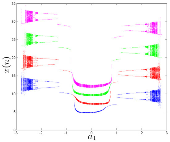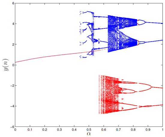 In addition, the fractional order is considered as bifurcation parameter, and the bifurcation diagrams are derived as shown in Figure 5. Note that the blue diagrams are obtained for the IC and system parameters , while the red diagram is obtained for IC . It is observed that the new system produces more complex dynamics than the integer-order map (1). In particular, for the corresponding integer-order value the fractional map is periodic; however, it becomes chaotic as the fractional-order value decreases, which indicates that the dynamic characteristic of the system is more complex. Moreover, the ICs have the same bifurcation behavior after entering the chaotic state via the inverse period bifurcation, but the red diagram lags behind the blue diagram. Finally, the fractional memristor map returns to the periodic state via the internal recovering crisis. The above numerical simulations demonstrate that the fractional memristor map with hidden attractors and under the Grunwald operator can describe the coexisting multiple phenomena [26,27,28].