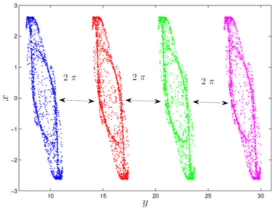 By fixing , and varying , the attractors are displayed in Figure 7 for , where . Clearly, all these hidden chaotic attractors have the same shape as the regime of homogenous multistability .