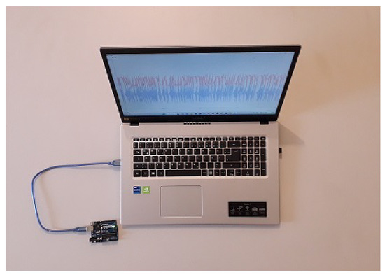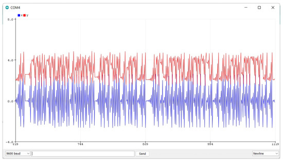 The map has been implemented by using the Equation (12). We have considered the trade-off between the computation complexity, the approximate error, and the limit resource of the hardware platform [29]. The truncation length L is 20. We have used the Arduino Uno board with an ATmega328P microcontroller. The microcontroller board is connected to a laptop via a USB cable (please see Figure 8). We realized the proposed map for the case , , , , . Obtained signals are recorded and captured from the micro-controller. The experimental result in Figure 9 confirms chaos in the map. It is noted that the state y of the map has both positive and negative values based on the selected initial condition. We have implemented the map with the initial condition (1,2). Therefore, the experimental result matches with the numerical result in Figure 1a, where the value of the state y is positive.