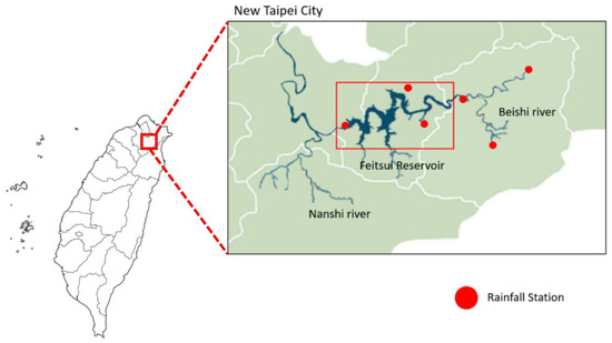 The Feitsui Reservoir is one of the main reservoirs in Taiwan’s Taipei metropolitan area. It is located on the Beishi River, a tributary of the Xindian River. The reservoir covers Xindian District, Shiding District, and Pinglin District in Greater Taipei City, with a total capacity of about 406 million cubic meters, making it the second largest reservoir in Taiwan. The reservoir is about 30 km away from downtown Taipei. The catchment area covers Xindian District, Shiding District, Pinglin District, and Shuangxi District in Greater Taipei City, with a total area of 303 square kilometers, as shown in Figure 1 (https://www.feitsui.gov.taipei/, accessed on 1 October 2022).