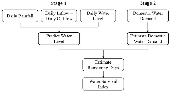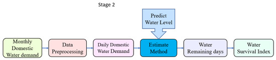 In many types of research on reservoir water levels, many related kinds of research only end with the water level prediction. This study hopes that subsequent warning studies can be conducted after obtaining the water level prediction to provide relevant units as a reference. Therefore, the study was divided into two stages. In the first stage, daily rainfall, daily inflow minus daily outflow, and historical Feitsui Reservoir water level were used to predict the water level of the Feitsui Reservoir in the future. The second stage converted the monthly domestic water demand into daily domestic water demand by the interpolation method. The reservoir water level was converted into water quantity to calculate the remaining days as the output variable. Finally, the WSI proposed in this study was calculated to provide the domestic water warning. The overall research process is shown in Figure 2.