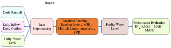 In the first stage, the data source of this study was the monthly operating report of the Feitsui Reservoir of the Ministry of Economic Affairs and Water Conservancy of the Executive Yuan, from 1 January 2000 to 31 December 2021, in the Open Platform of Government data. First, it was determined whether missing values existed in the data, and then a correlation analysis was conducted. An analysis result of zero indicated no correlation between the two variables, and the larger the value, the stronger the correlation [10]. Next, the data were normalized. Then, 70% of the integrated dataset samples were used as training, 15% as validation, and 15% as testing. In machine learning, RF, M5P, LR, and SVR were used as models to predict the water level value of the Feitsui Reservoir on the next prediction days. Finally, R2, RMSE, MAE, and MAPE were used to evaluate the model’s performance, as shown in Figure 3.