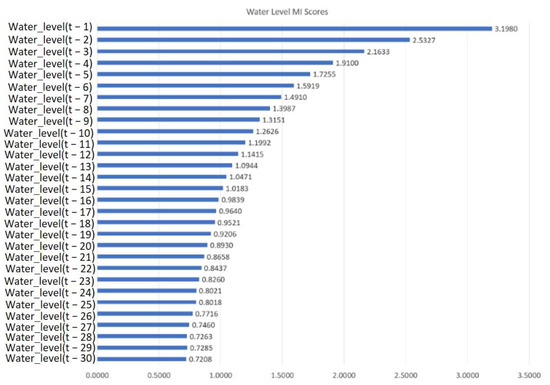 In this study, the time capture range of the Feitsui Reservoir operation monthly report data was set as 1 January 2000 to 31 December 2021, with a total of 8036 data points. First, the IsNull method of the DataFrame object in Python was used to check whether there were any missing values in the data table. Then, the sum method was applied to return several missing values in each feature field, and the return number of each field was 0 to verify that there were no missing values. In addition, Mutual Information (MI) was used for correlation analysis. Firstly, the study conducted an autocorrelation analysis of the daily water level of the Feitsui Reservoir, as shown in Figure 5. Secondly, a correlation was made between the daily water level of the Feitsui Reservoir and the delay of daily rainfall in the catchment area. Finally, a correlation was made between the daily water level of the Feitsui Reservoir and the daily inflow minus the daily outflow of the reservoir. In the final process of data pre-processing, the data of the Feitsui Reservoir with a daily water level delayed for 15 days were selected for the subsequent study. Due to the significant differences between the values of each variable data, this study used normalization and finally used 70% of the integrated dataset samples as training, 15% as validation, and 15% as testing.