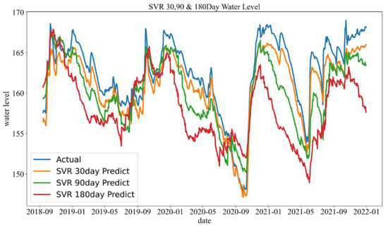 In the second stage of this study, SVR was used to predict the reservoir water level after 30 days, 90 days, and 180 days. The prediction results are shown in Figure 6, and Table 4 shows the evaluation of the SVR prediction model.