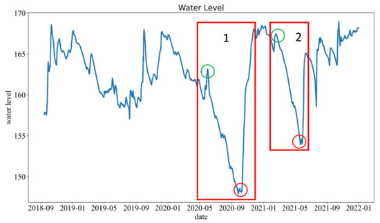 As the warning of the reservoir water level focuses on the warning of a water shortage, two periods with large water shortage levels were marked with red frames in this study, as shown in Figure 7, so as to facilitate subsequent discussion. Zone 1 had 117 days from the green circle high on 2 June 2020 to the red circle low on 27 September 2020, and Zone 2 had 101 days from the green circle high on 18 February 2021 to the red circle low on 30 May 2021.