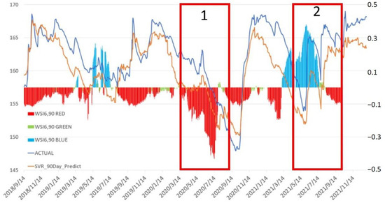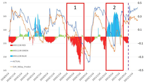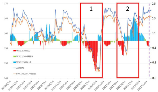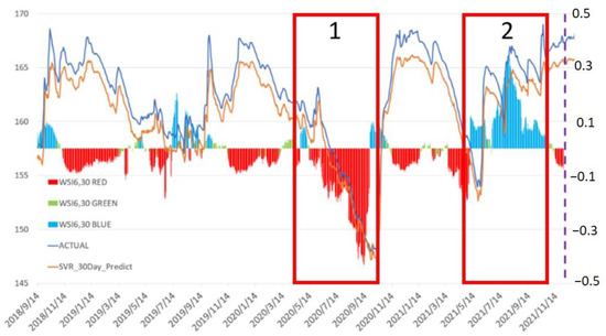 The second stage of this study was to use SVR to predict the reservoir water level after 30, 90, and 180 days and then calculate the effective storage volume of the reservoir from the reservoir water level, dividing the current effective reservoir capacity by the daily domestic water demand of the Greater Taipei City’s population. The result was the number of days remaining in the reservoir. Finally, the WSI proposed in this study was obtained by using short-term and long-term bias ratios. The calculation results of the WSI are explained in the next section.